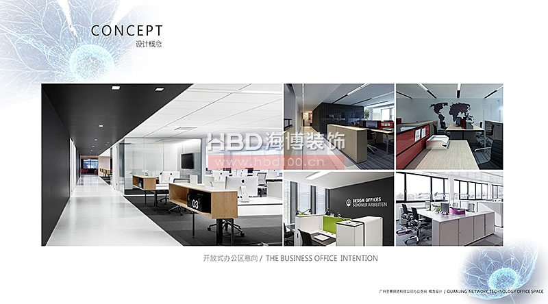 本案網絡科技公司位于廣州富力盈隆大廈,辦公室設計裝修包含前臺區域、獨立辦公室設計、公共辦公區設計以及茶水文印區設計,海博裝飾設計師根據客戶需求通過明亮、鮮艷、跳躍的顏色作為點綴,刺激工作人員的想象力。墻面、地板乃至桌椅的色彩也能反映出企業特有的精神面貌。同時運用燈光及一些隔斷裝飾舒適地賦予了企業科技感和現代感。接下來讓我們一覽提案設計方案。