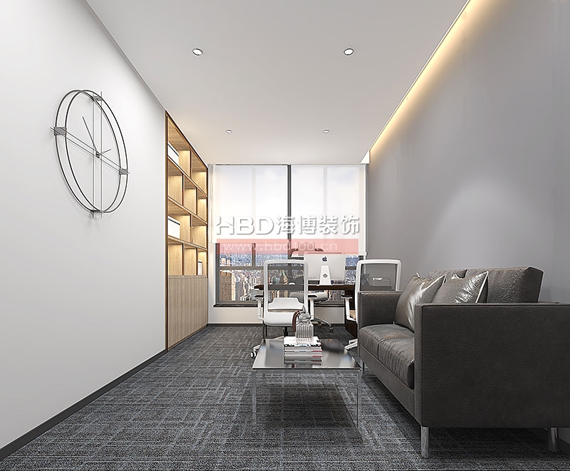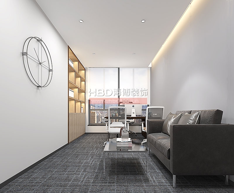 本案辦公樓裝修設計項目位于廣州珠江之畔的北島創意園,海博裝飾設計師結合現有場地條件,并在明確品牌定位及經營特色的前提下,引入多元化的經營服務模式,營造集紳士課程、展示、體驗與時尚生活沙龍為一體的綜合型培訓機構。辦公樓設計風格偏向英倫風,簡約大氣,同時配有茶室、高爾夫游戲室、天臺花園、健身室等空間。為了體現客戶的朝陽行業特性,海博裝飾的設計從入口開始就牢牢抓住人們的眼球,表現出鮮明的企業形象,讓人過目難忘。好似一個精靈活躍在整個空間里,跳躍,靈動,充分適用于公司的需求。下面一起進入效果圖方案設計現場。