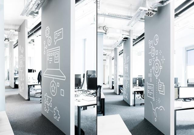 app開發軟件公司辦公室裝修設計適合什么裝修風格呢?本案整個辦公空間以墻面的平面設計為主,其設計用以簡單的形狀,鮮艷的顏色和清晰的象形圖靈感來自Look4app專業的應用程序的圖標。據廣州裝修設計公司了解其中3.5米高的蝙蝠俠圖案,是受員工喜愛的哦。趕快為您的員工們來一個同款吧!我司裝修咨詢18026207127,期待與您的合作哦!
