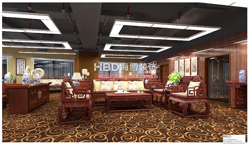 本案中采用現代中式風格,格調高雅,造型樸素優美,色彩濃厚而成熟。設計師結合古典中式的裝飾元素,來呈現亦古亦今的空間氛圍。傳統風與現代風的碰撞,使整體空間感覺更加豐富,大而不空、厚而不重,有格調又不顯壓抑。各個區域的燈帶回旋穿插,使整個辦公室明亮,簡潔,而又富有變化性。金條紋地毯裝點空間,更散發出高貴奢華之美。